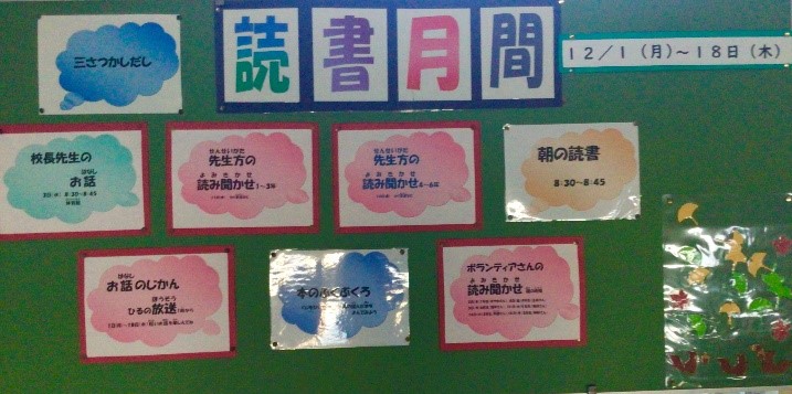 12月は「読書月間」でした。全校で、読書に親しむ習慣が身につくよう、いろいろな取り組みを実施しました。 お昼の放送では、先生方による放送での小話の読み聞かせがありましたが、とても好評で、話の展開にわくわくしながら聞いていました。耳だけで聞くというのも、想像力が高まっていいですね。3日(水)の朝は校長先生による本の紹介がありました。その中に「大ピンチずかん」の読み聞かせがあり、新作を一部読んでもらって、子どもたちは、どんなピンチの乗り切り方があるか想像しながら楽しんで聞いていました。