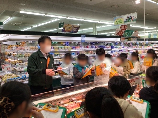 1月28日(水)にA・コープすこう店へ見学に行き、商品の陳列の工夫を教えてもらったり、バックヤードを見せてもらったりしました。お肉やお魚を切る様子や、野菜を切って包装し値段をつけるところを間近で見ることができ、とても新鮮で貴重な体験をさせていただきました。お客さんのいる中お邪魔したのにもかかわらず親切に対応してくださったことにも、子どもたちは感謝していました。