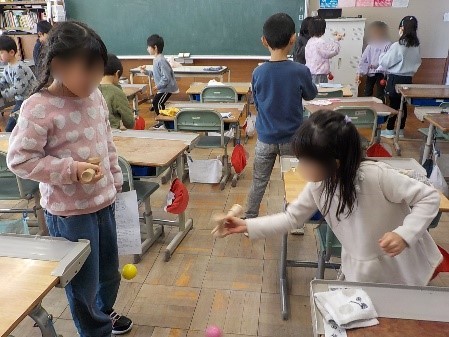 最近の様子_令和7年度2年生が、「とめけん」や「もしかめ」など、自分が出来るようになった技を1年生の前で発表するけん玉交流会がありました。技を披露するだけでなく、うまくいくためのコツも伝え、その後、一緒にけん玉を楽しみました。教え方が上手な子が多く、短い時間でしたが、1年生がぐんぐん上達していくのがわかりました。1年生に「すごい!」と言われると、照れながらもとっても嬉しそうな2年生でした。