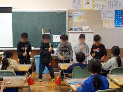 2年生が、「とめけん」や「もしかめ」など、自分が出来るようになった技を1年生の前で発表するけん玉交流会がありました。技を披露するだけでなく、うまくいくためのコツも伝え、その後、一緒にけん玉を楽しみました。教え方が上手な子が多く、短い時間でしたが、1年生がぐんぐん上達していくのがわかりました。1年生に「すごい!」と言われると、照れながらもとっても嬉しそうな2年生でした。